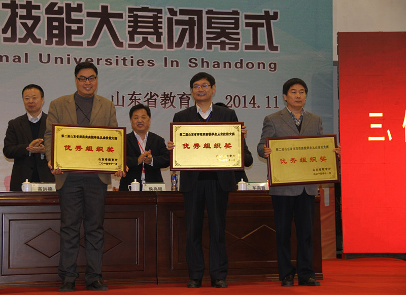 山东省师范类高校学生从业技能大赛从2013开始举办,旨在适应基础教育改革发展对师资培养的需求,从实战角度强化教师基本技能的教学与训练,检验师范生培养质量,全面提升师范类高校学生的教学技能和实践应用能力,充分调动师范类学生专业学习的积极性、主动性和创造性,进一步提高求职技能和就业竞争力,促进教师教育的发展。本届大赛分学前、小学、初中、高中四个学段,其中小学学段包括语文、数学、英语三个学科,初中、高中学段包括语文、数学、英语、物理、化学五个学科,比赛项目包括说课、模拟上课、答辩三个部分。我校参加了小学英语和初中、高中学段语文、数学、英语、物理、化学五个学科的决赛。