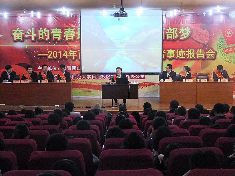 4月25日下午,日照校区图书馆报告厅座无虚席,掌声阵阵,由共青团山东省委志愿者工作部主办、华体会官方网页版_华体会(中国)日照校区学生工作办公室承办的“奋斗的青春最美丽·炫我西部梦”——2014年西部计划优秀志愿者事迹报告会在这里隆重举行。共青团新疆维吾尔自治区委志愿者工作部部长李鑫,共青团山东省委志愿者行动指导中心综合部副部长陈宝军,华体会官方网页版_华体会(中国)日照校区机关党总支书记、学生工作办公室主任孔令军、各院系团总支书记以及学生代表认真聆听了报告。