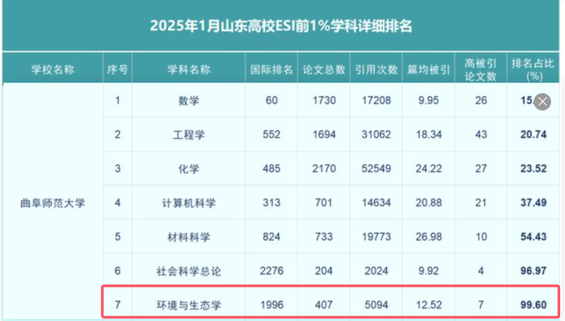 曲阜师大环境/生态学学科进入ESI世界排名前1%