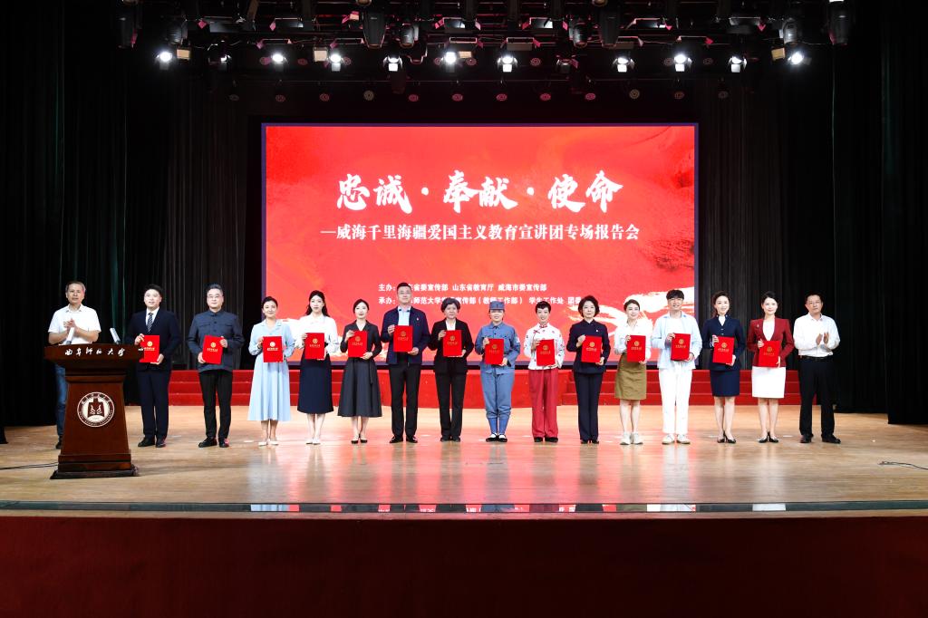 宣讲会上,宣讲团以“千里海疆红色史诗”为脉络,通过多个主题节目展开生动叙事。宣讲团首先以《甲午警世钟》拉开序幕,循着重见天日的定远舰铁甲,回溯甲午海战的悲壮历程。《旗帜》呈现了胶东第一支人民抗日武装在党的领导下走过的光辉历程。《我们的奶奶从未走远》讲述了108岁革命老人王淑珍始终坚守入党初心,用一辈子奋斗践行誓言的传奇人生。《胶东乳娘:战火中的爱与守护》再现了威海乳山300多位“红色乳娘”在战火中用乳汁哺育1223名革命后代且无一伤亡的大义壮举,让现场师生深切感受到信仰力量。《马石山十勇士:舍身忘死恸山河》聚焦马石山十勇士不惧牺牲而救援群众的英雄事迹。《他们就是最可爱的人》展现了威海抗战老兵参加抗美援朝战争、英勇保家卫国的峥嵘历史。《永远的怀念》讲述了科学家郭永怀为拯救重要科研资料而壮烈牺牲的故事,让现场师生潸然泪下。《“威海制造”耀国威》呈现了威海优秀企业和企业家大力弘扬劳模精神、劳动精神、工匠精神,为实现强国梦所作的贡献。