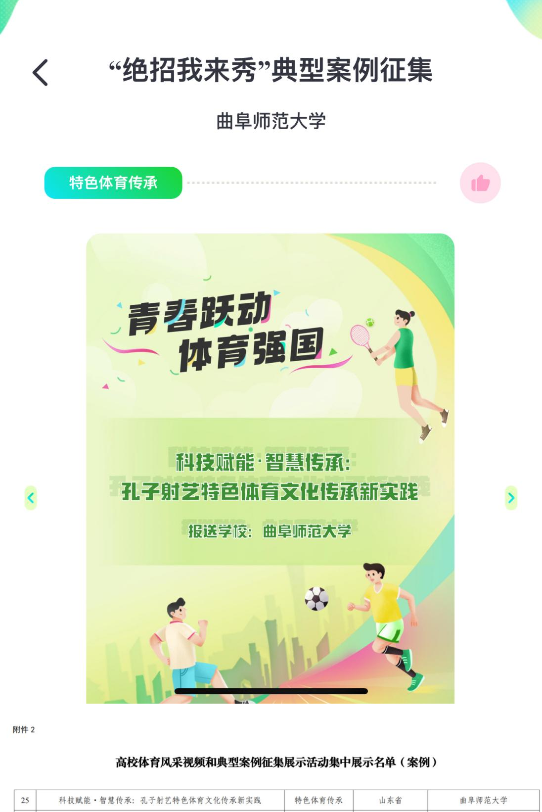 体育科学学院讯 近日,教育部宣传教育中心公布了“高校体育风采视频和典型案例征集展示活动集中展示作品名单”,华体会官方网页版_华体会(中国)体育科学学院报送的“科技赋能・智慧传承:孔子射艺特色体育文化传承新实践”入选,在“人民网+”客户端、人民日报少年客户端集中展示。