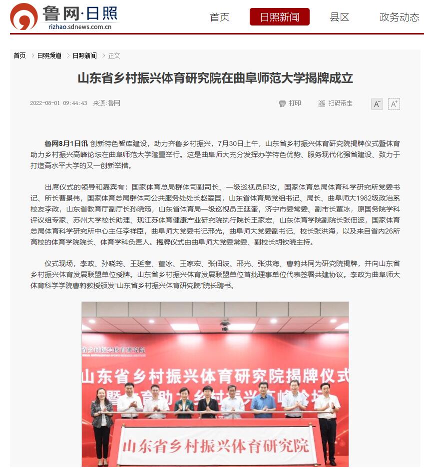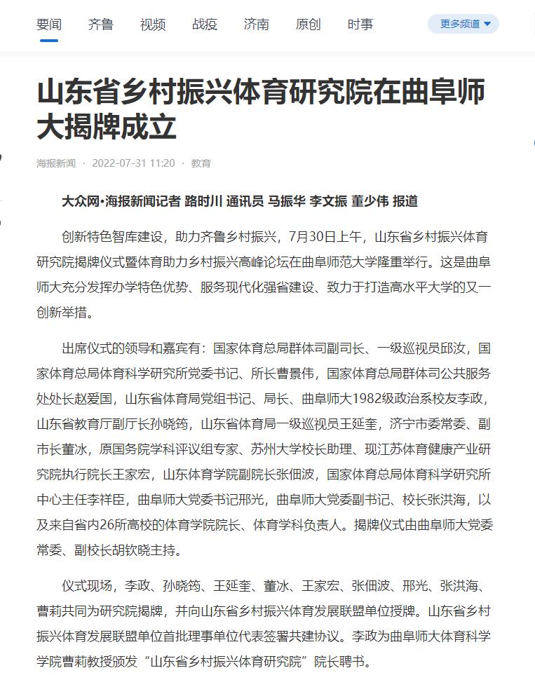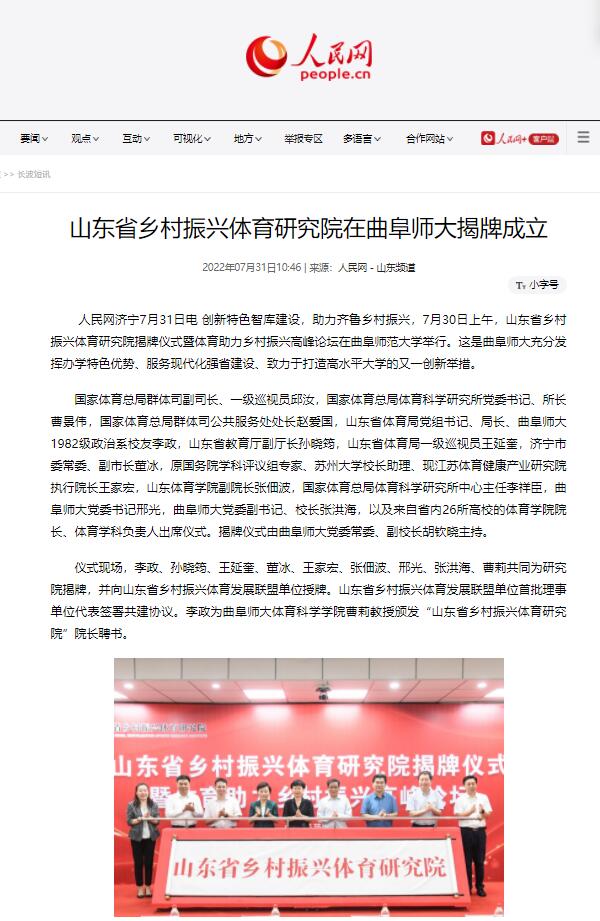 【人民网】山东省乡村振兴体育研究院在曲阜师大揭牌成立
