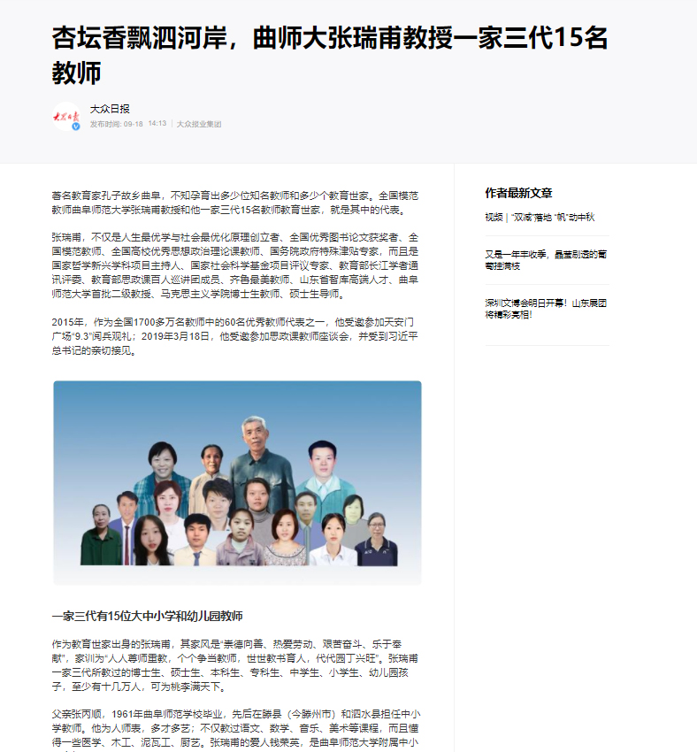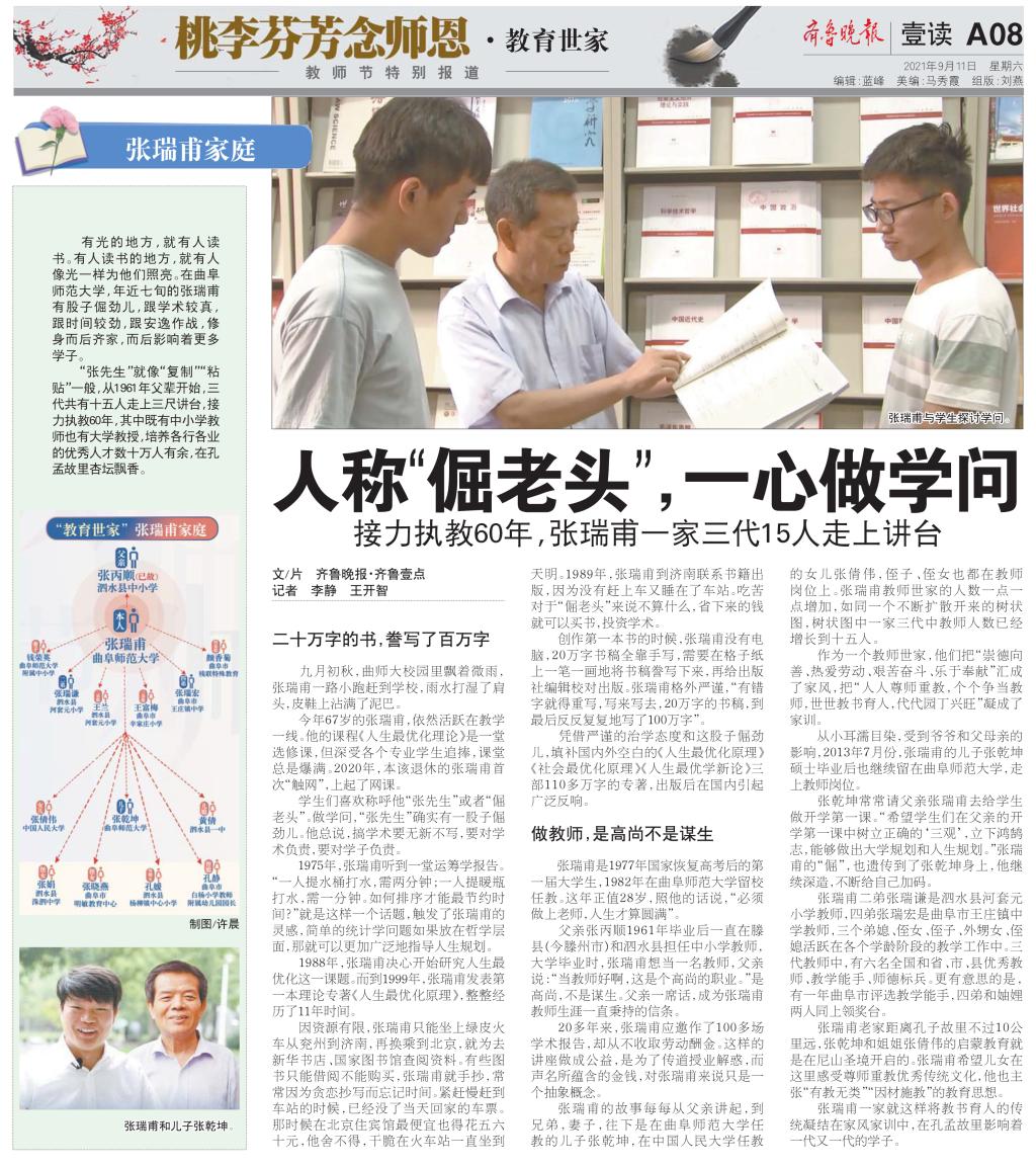齐鲁晚报:接力执教60年,曲阜师大张瑞甫一家三代15人走上讲台