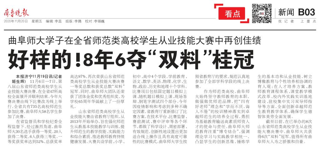 齐鲁晚报:8年6夺“双料”桂冠!曲阜师大学子在全省师范类高校学生从业技能大赛中再创佳绩
