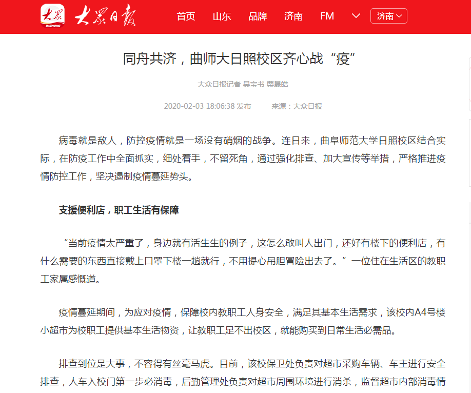 大众日报客户端:同舟共济,曲师大日照校区齐心战“疫”