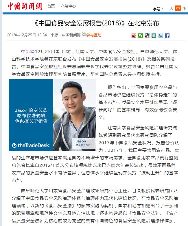中国新闻网:《中国食品安全发展报告(2018)》在北京发布