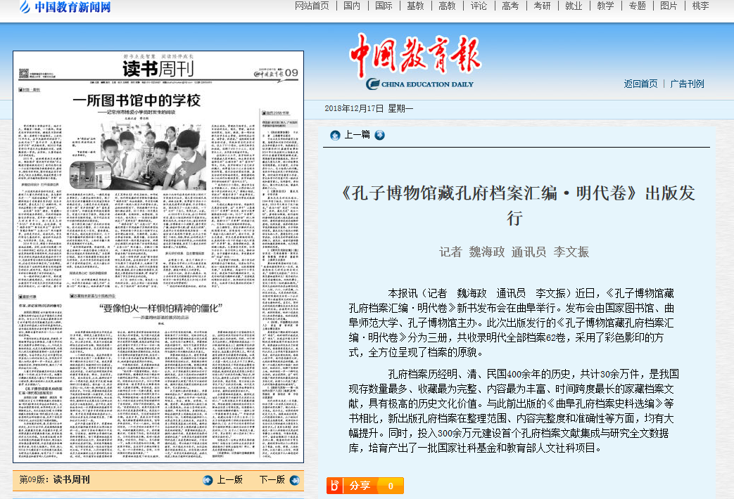 中国教育报:《孔子博物馆藏孔府档案汇编·明代卷》出版发行