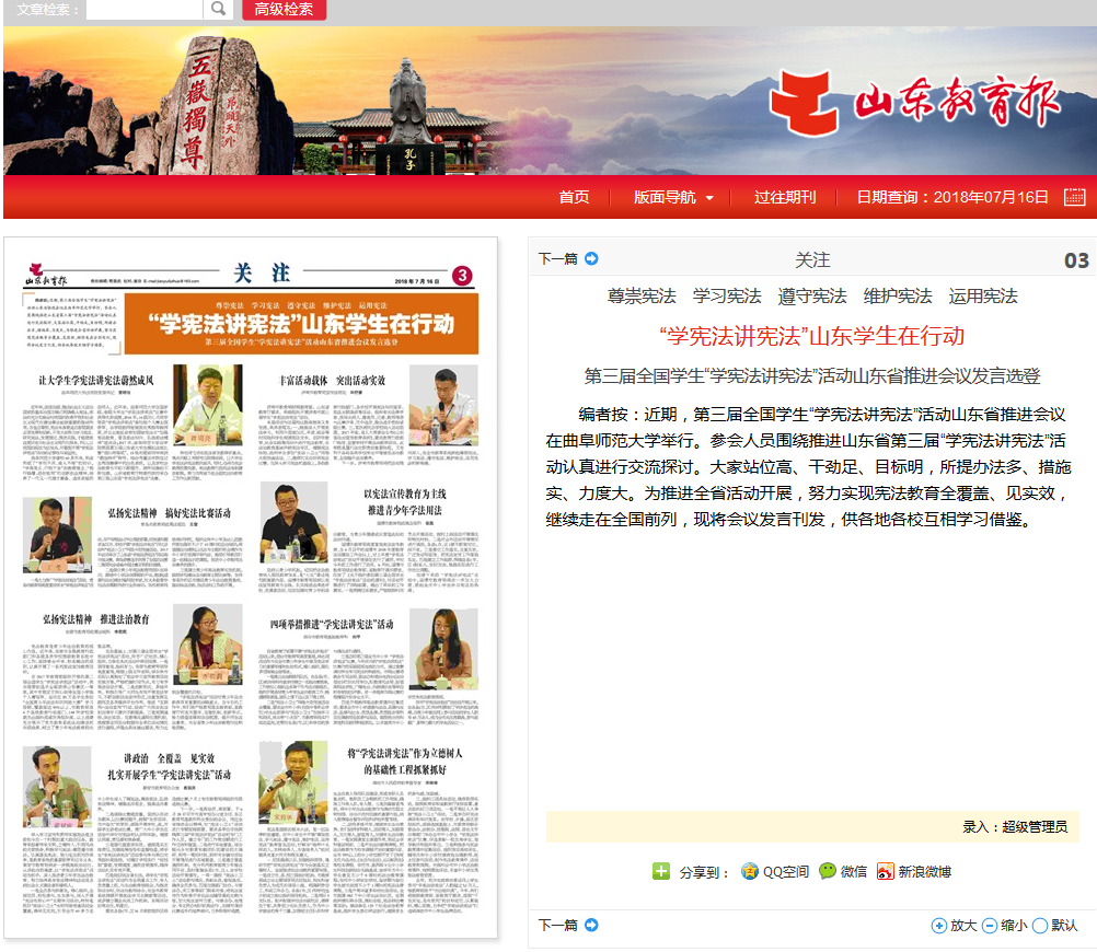 山东教育报:全国学生“学宪法讲宪法”活动山东省推进会议在曲阜师大举行