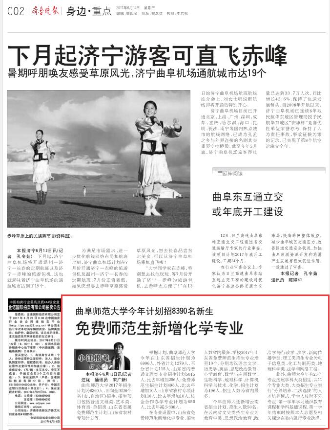 齐鲁晚报:曲师大今年计划招8390名新生 免费师范生新增化学专业