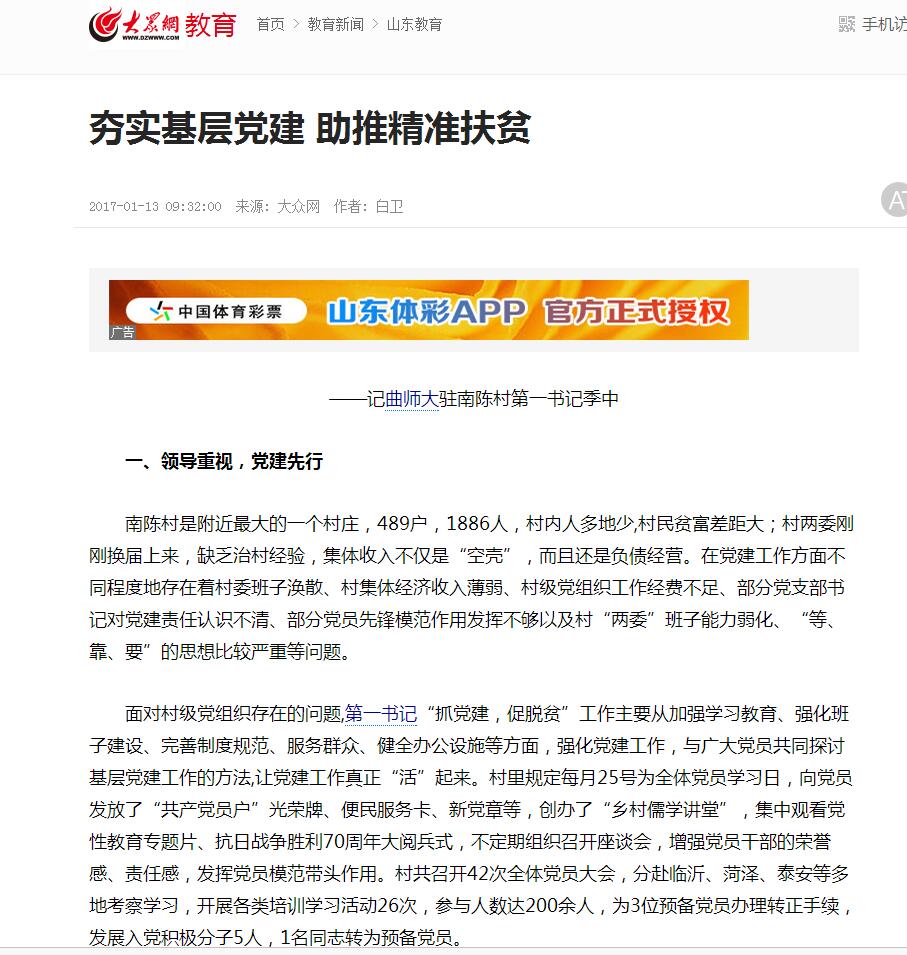 大众网:夯实基层党建 助推精准扶贫——记曲师大驻南陈村第一书记季中