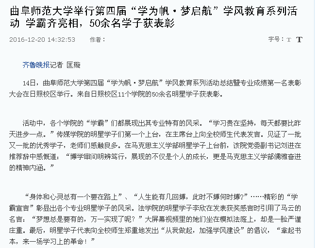 齐鲁晚报:华体会官方网页版_华体会(中国)举行第四届“学为帆·梦启航”学风教育系列活动 学霸齐亮相,50余名学子获表彰