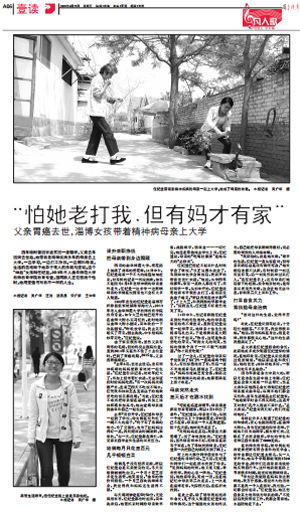 任纪兰,我校教育科学学院 2013级大学生。四年级时曾因家庭贫困一度辍学,父亲去年因病去世后,她带着患精神疾病多年的母亲上大学。一边学习,一边打工挣钱,一边照料母亲。生活的苦难赋予她异于常人的乐观与坚韧,她用坚强和乐观书写着不一样的人生。