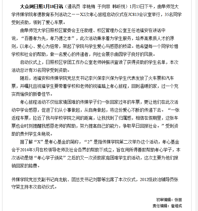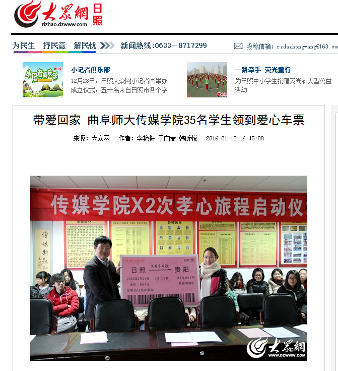 大众网:带爱回家 曲阜师大传媒学院35名学生领到爱心车票