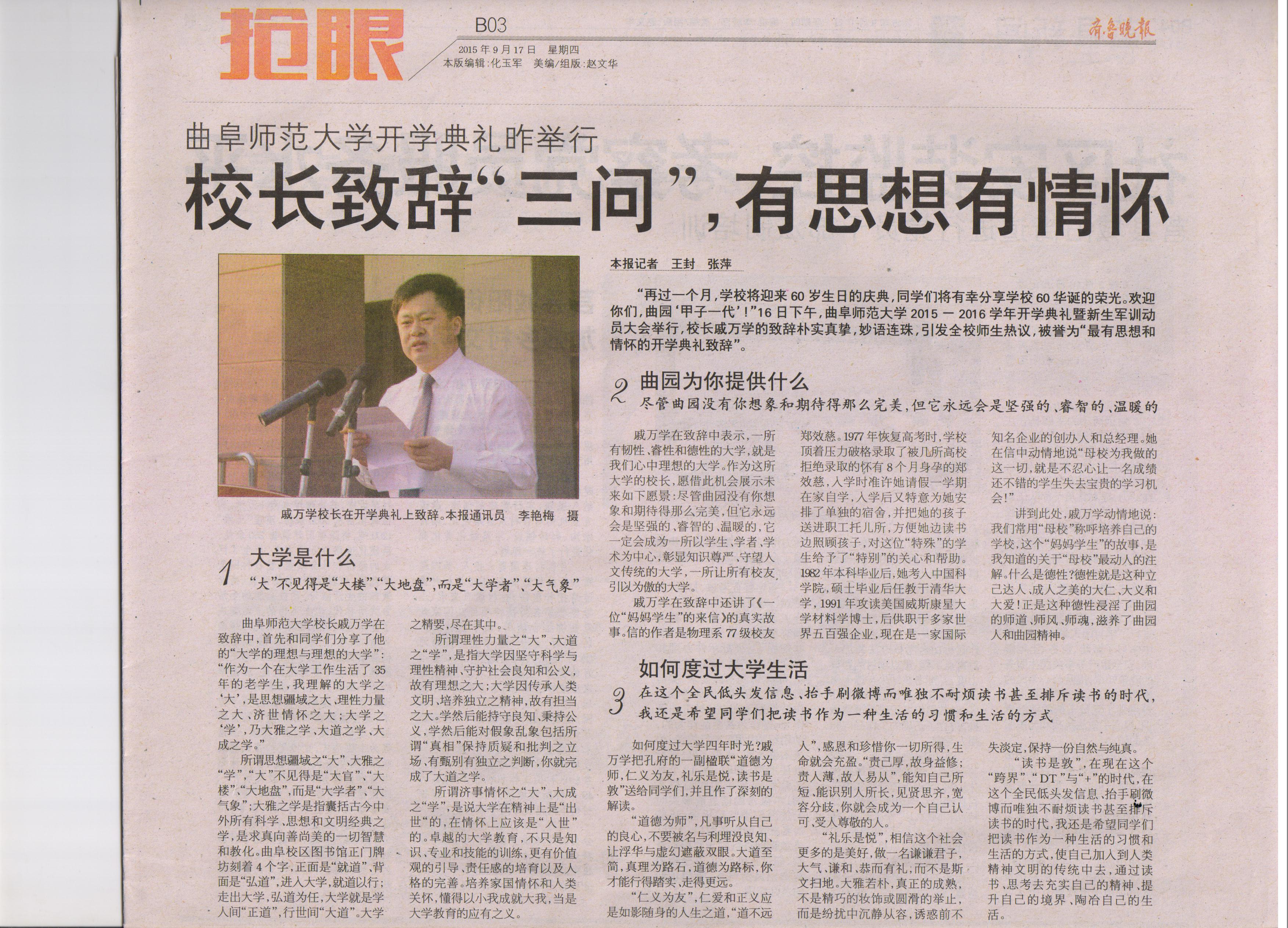 齐鲁晚报:华体会官方网页版_华体会(中国)开学典礼,戚万学校长致辞“三问”,有思想有情怀