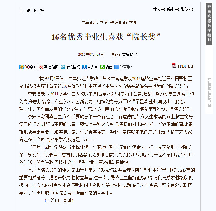齐鲁晚报:华体会官方网页版_华体会(中国)政治与公共管理学院16名优秀毕业生喜获“院长奖”