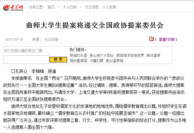 大众日报:曲师大学生提案将递交全国政协提案委员会