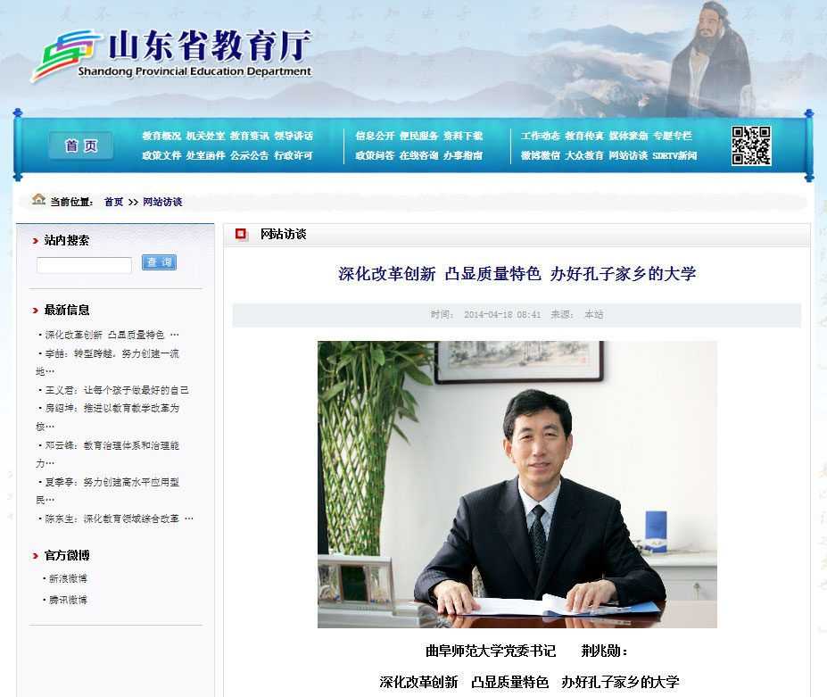 教育厅网站专访我校党委书记荆兆勋——深化改革创新 凸显质量特色 办好孔子家乡的大学