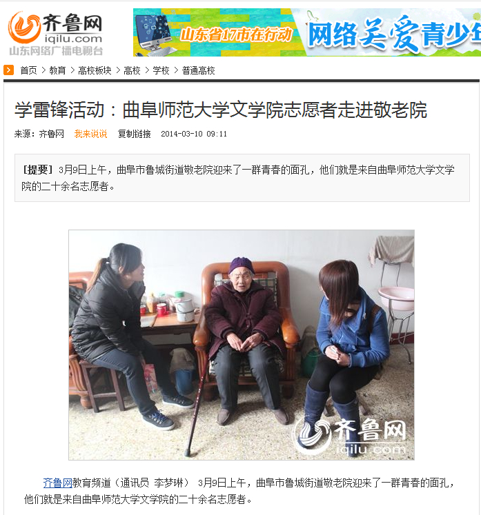 齐鲁网:学雷锋活动:华体会官方网页版_华体会(中国)文学院志愿者走进敬老院