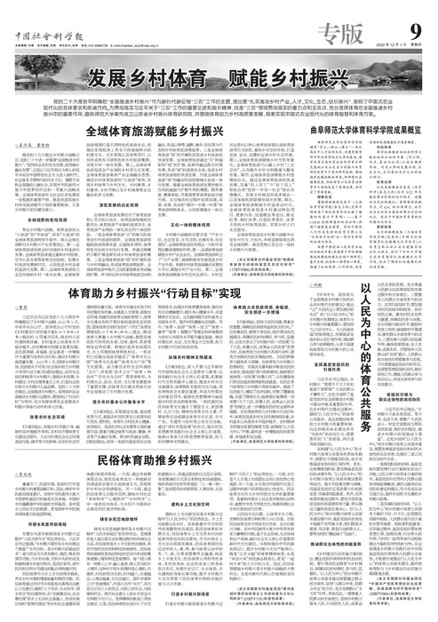 曲阜师大体育科学学院讯 日前,中国社会科学报在“发展乡村体育、赋能乡村振兴”专版中刊登了华体会官方网页版_华体会(中国)山东省乡村振兴体育研究院执行副院长曹莉教授团队的系列成果,其内容包括:体育助力乡村振兴“行动目标”、构建以人民为中心的体育公共服务、全域体育旅游赋能乡村振兴、民俗体育助推乡村振兴等主题的阶段性战略研究。报道还对学校体育科学学院近年来取得的相关成绩进行了列举,相关科研成果为全国农村体育发展提供理论依据和现实借鉴,标志着团队的研究在乡村体育领域处于省内领先地位、对全国乡村体育研究形成较大影响。