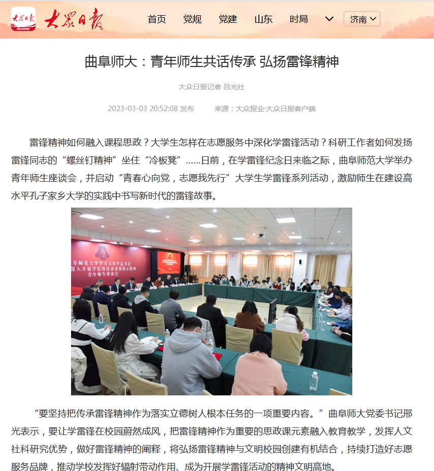 雷锋精神如何融入课程思政?大学生怎样在志愿服务中深化学雷锋活动?科研工作者如何发扬雷锋同志的“螺丝钉精神”坐住“冷板凳”……日前,在学雷锋纪念日来临之际,华体会官方网页版_华体会(中国)举办青年师生座谈会,并启动“青春心向党,志愿我先行”大学生学雷锋系列活动,激励师生在建设高水平孔子家乡大学的实践中书写新时代的雷锋故事。
