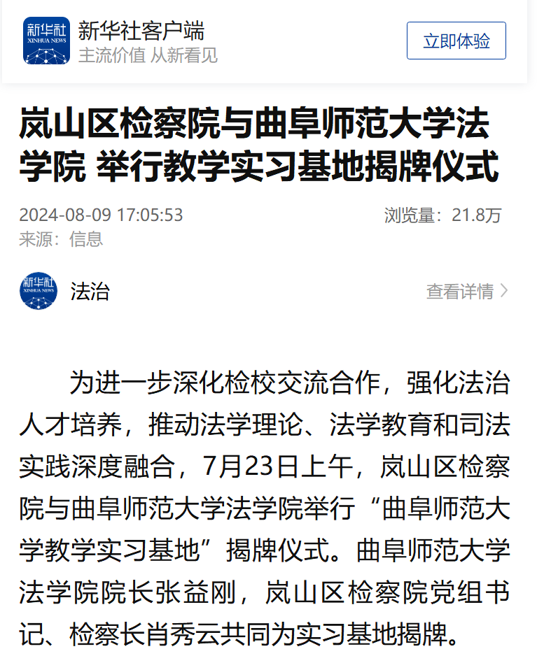 【新华社客户端】岚山区检察院与华体会官方网页版_华体会(中国)法学院举行教学实习基地揭牌仪式