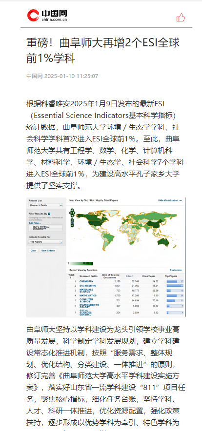 【中国网】曲阜师大再增2个ESI全球前1%学科