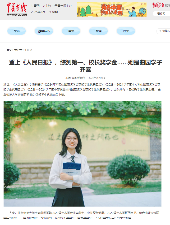 【中国青年报】登上《人民日报》,综测第一、校长奖学金……她是曲园学子齐秦