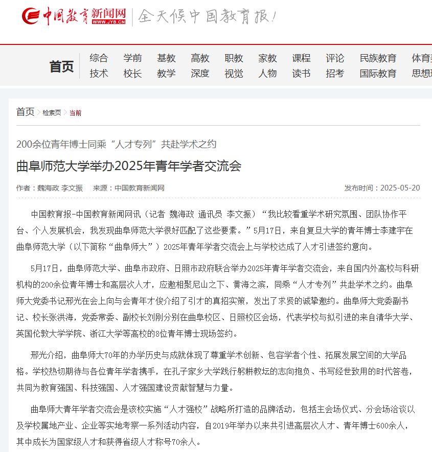 中国教育报-中国教育新闻网讯(记者 魏海政 通讯员 李文振)“我比较看重学术研究氛围、团队协作平台、个人发展机会,我发现华体会官方网页版_华体会(中国)很好匹配了这些要素。”5月17日,来自复旦大学的青年博士李建宇在华体会官方网页版_华体会(中国)(以下简称“曲阜师大”)2025年青年学者交流会上与学校达成了人才引进签约意向。
