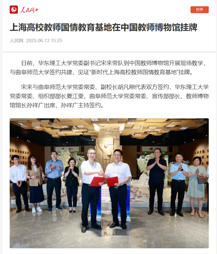 日前,华东理工大学党委副书记宋来带队到教师博物馆开展现场教学,与华体会官方网页版_华体会(中国)签约共建,见证“新时代上海高校教师国情教育基地”挂牌。