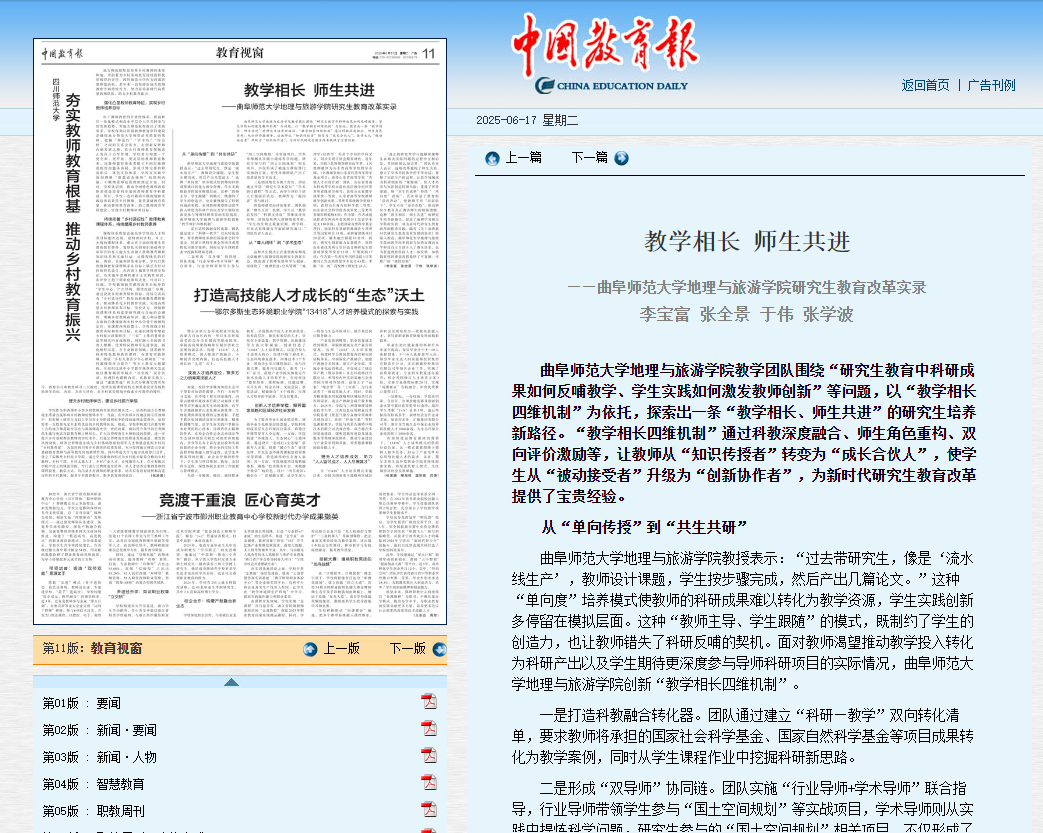 华体会官方网页版_华体会(中国)地理与旅游学院教学团队围绕“研究生教育中科研成果如何反哺教学、学生实践如何激发教师创新”等问题,以“教学相长四维机制”为依托,探索出一条“教学相长、师生共进”的研究生培养新路径。“教学相长四维机制”通过科教深度融合、师生角色重构、双向评价激励等,让教师从“知识传授者”转变为“成长合伙人”,使学生从“被动接受者”升级为“创新协作者”,为新时代研究生教育改革提供了宝贵经验。