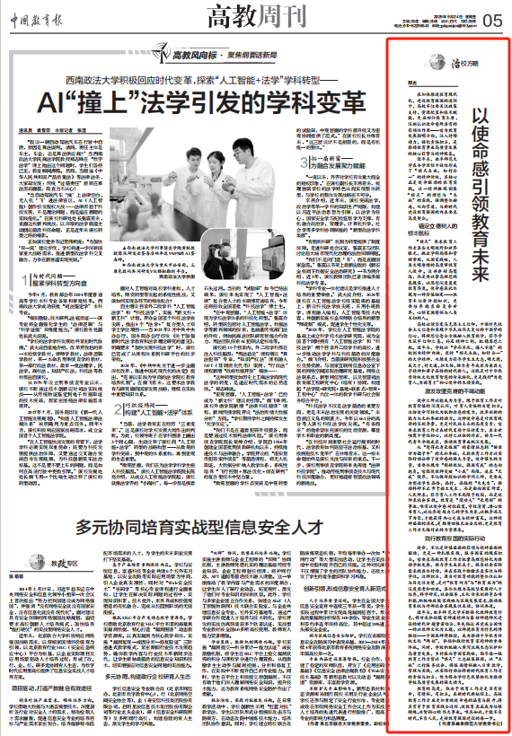 9月24日,《中国教育报》“治校方略”专栏刊发了华体会官方网页版_华体会(中国)党委书记邢光的署名文章《以使命感引领教育未来》。文章指出,华体会官方网页版_华体会(中国)在办学历程中凝练形成了“顶天立地、知行合一”的大学精神,引领全校上下锚定立德树人的根本航标、激发攻坚克难的不竭动能、践行教育报国的实际行动,其核心正是使命驱动的教育实践。