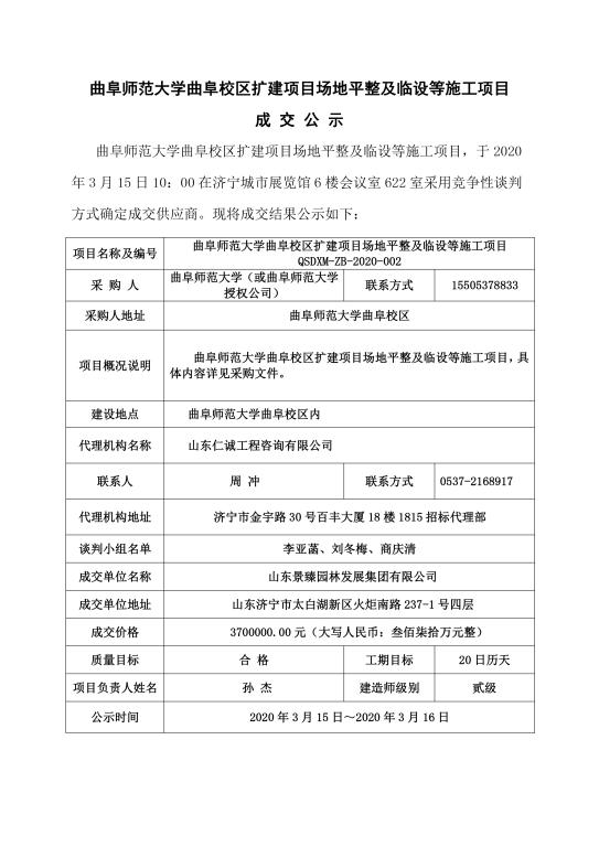 华体会官方网页版_华体会(中国)曲阜校区扩建项目场地平整及临设等施工项目成 交 公 示