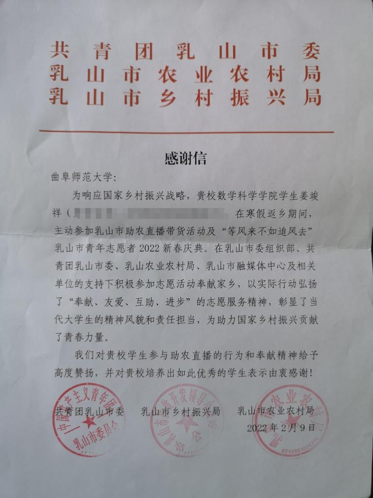 曲阜师大新闻中心讯 (通讯员:杜逸群 )日前,曲阜师大数学科学学院学子姜竣祥利用寒假返乡课余时间主动参与到乳山市助农直播带货活动中,并积极参加“等风来不如追风去”乳山市青年志愿者2022新春庆典,彰显了曲园学子勇于担当、乐于奉献、崇德向善的良好精神风貌。