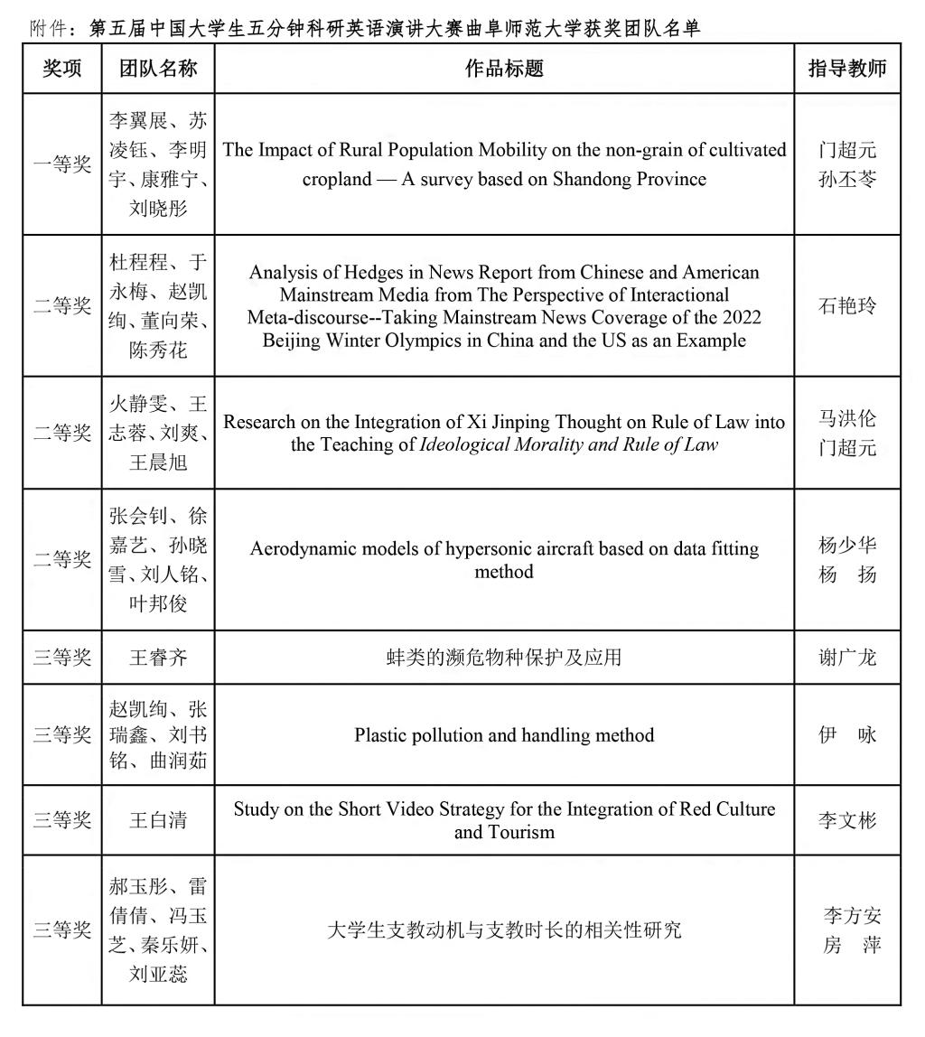 曲阜师大新闻中心讯 日前,第五届中国大学生五分钟科研英语演讲大赛在中国科学院大学圆满落下帷幕,由华体会官方网页版_华体会(中国)选拔推荐的8个团队取得优异成绩,获得全国一等奖1项、二等奖3项、三等奖4项。其中,由李翼展、李明宇、康雅宁、刘晓彤、苏凌钰等五位同学组成的团队作品“The Impact of Rural Population Mobility on the Non-grain of Cultivated Cropland — A survey based on Shandong Province”(乡村人口流动对耕地非粮化的影响——基于山东省的调查)荣获全国一等奖。门超元、孙丕苓等10位教师荣获优秀指导教师奖。