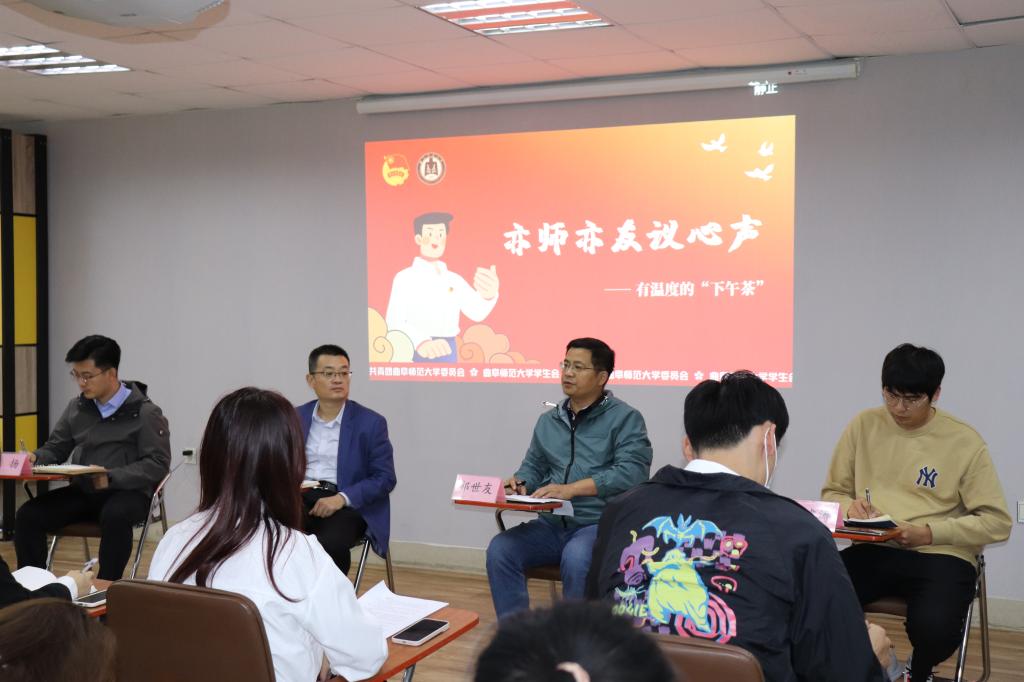 曲阜师大新闻中心讯(通讯员:张颖) 为进一步落实“以学生为本”的工作理念,切实开展“我为同学办实事”活动,10月5日,曲阜师大团委、学生会分别于曲阜校区和日照校区举办2022-2023学年第一期“亦师亦友议心声”——有温度的下午茶师生座谈会。学生工作处、教务处、后勤管理处、校团委、校医院相关负责人以及各学院学生代表参加座谈会。