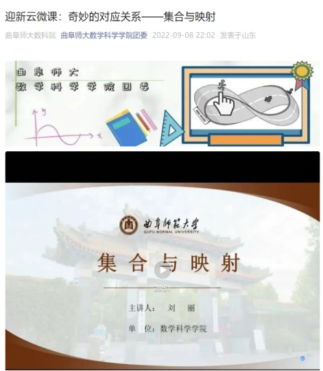 曲阜师大新闻中心讯(通讯员:韦宁)为创新人才培养途径,拓展“全程育人”空间,曲阜师大数学科学学院就大学与高中知识的链接问题进行了全面系统的分析,在2022级新生入学前,先后推出“参数方程与极坐标”“反三角函数”“积化和差、和差化积”“数学危机”“复数及其运算”“集合与映射”等系列迎新云微课,探索大学和中学课程的无缝衔接模式。云微课的推出,受到了广大数学相关专业新生和社会各界的极大关注,点击量达到了上万次。