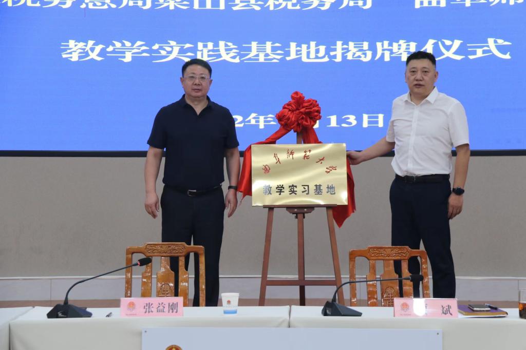 曲阜师大新闻中心讯 (通讯员:魏新宇)7月13日,为进一步开展校地合作,助推产学研融合发展以及教学实践基地建设,法学院与国家税务总局梁山县税务局举行校地合作签约揭牌仪式。法学院院长张益刚,梁山县税务局党委书记、局长贾斌出席活动,法学院集中实习指导老师和教师代表、梁山县税务局相关负责人共同参加活动。