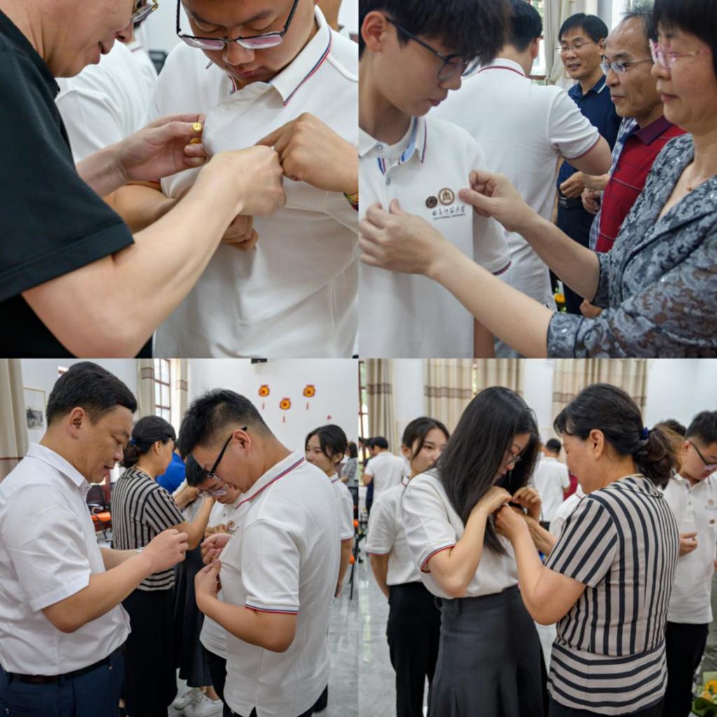 老师们为学生佩戴校徽