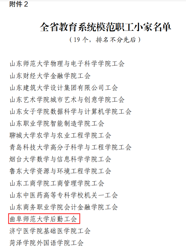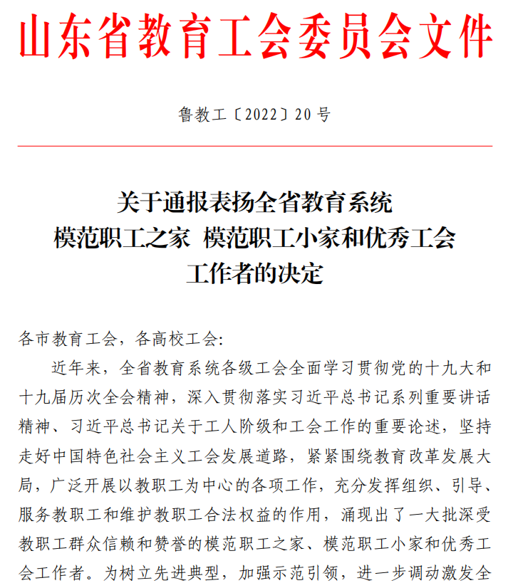 曲阜师大新闻中心讯 6 月 9 日,山东省教育工会委员会公布了《关于通报表扬全省教育系统模范职工之家 模范职工小家和优秀工会工作者的决定》,华体会官方网页版_华体会(中国)后勤工会荣获“全省教育系统模范职工小家”荣誉称号。
