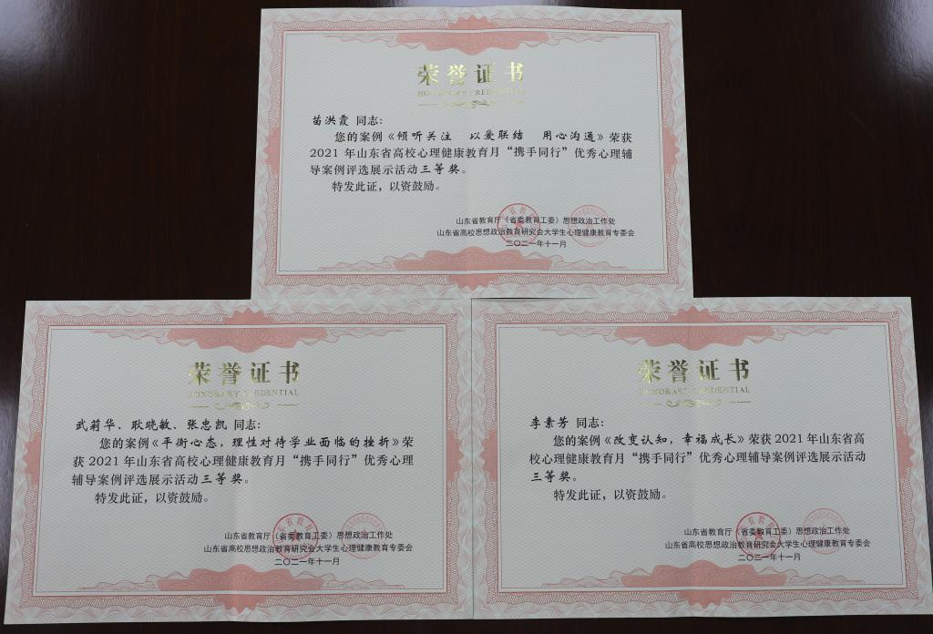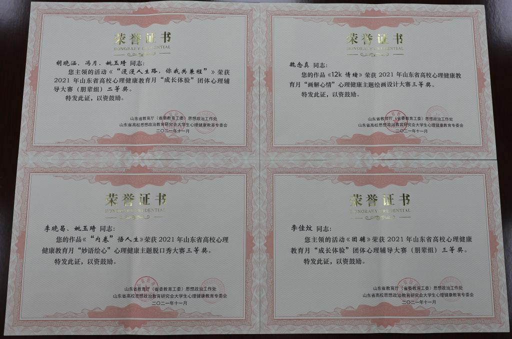 为认真落实2021年山东省高校心理健康教育月展示活动要求,2021年5月至6月心理健康教育与咨询中心开展了以“多彩校园 健康心态 蓬勃人生”为主题的第18届心理健康教育月活动。活动期间,各学院积极宣传、精心组织、鼓励学生广泛参与。苗洪霞撰写的《倾听关注 以爱联结 用心沟通》、李素芳撰写的《改变认知,幸福成长》和武莉华、耿晓敏、张忠凯三位老师撰写的《平衡心态,理性对待学业面临的挫折》获得“携手同行”优秀心理辅导案例三等奖;胡晓涵、冯月、姚玉琦获得“成长体验”团体心理辅导大赛(朋辈组)二等奖,李佳炆获得“成长体验”团体心理辅导大赛(朋辈组)三等奖;李晓曷、姚玉琦获得“妙语绘心”心理健康主题脱口秀大赛三等奖;魏念真获得“画解心情”心理健康主题绘画设计大赛三等奖。