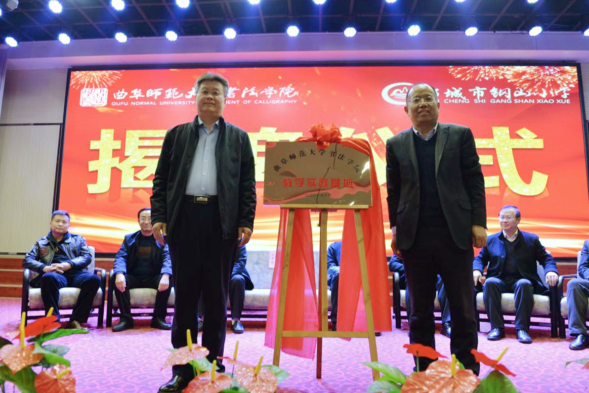 仪式上,党委书记、院长刘建新与钢山小学校长林西亭共同为教育实习基地揭牌。