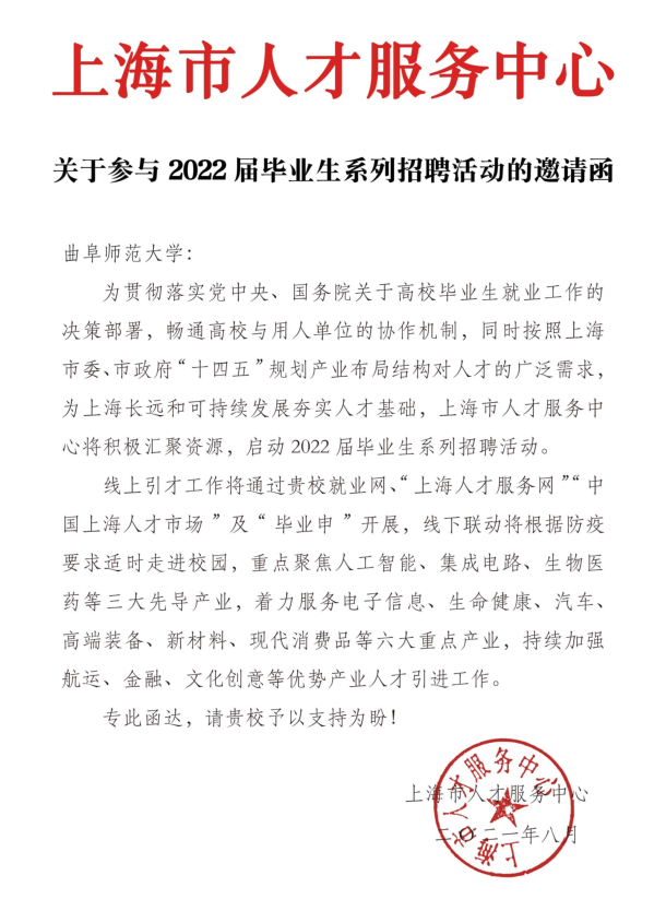 同时,上海市人才服务中心发来《关于参与2022届毕业生系列招聘活动的邀请函》,诚挚邀请我校继续参与2022届上海市线上引才工作,并通过线下联动,适时走进校园,围绕服务国家战略中心任务,共同为促进全国就业大局稳定贡献力量。