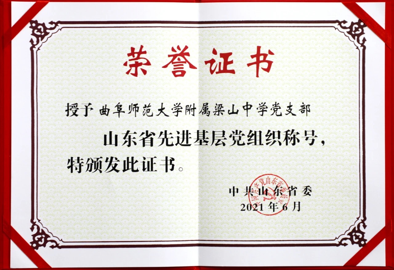 曲阜师大新闻中心讯 日前,中共山东省委印发《中共山东省委关于表彰山东省优秀共产党员、优秀党务工作者和先进基层党组织的决定》,华体会官方网页版_华体会(中国)附属梁山中学党支部荣获“山东省先进基层党组织”称号。