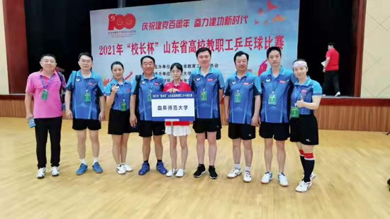 曲阜师大新闻中心讯(通讯员:孙衍) 7月5日至9日,由中国教育工会山东省委员会主办的2021年“校长杯”山东省教职工乒乓球比赛在烟台举行,我校乒乓球代表队在党委常委、副校长屈跃宽的带领下参加了此次比赛,我校代表队参加了团体、领导男单、教职工男单(40岁以上组和40岁以下组)、职工女单(40岁以上组)比赛,其中王曙光、王捷、史萌三位老师进入单打32强,我校荣获优秀组织奖。