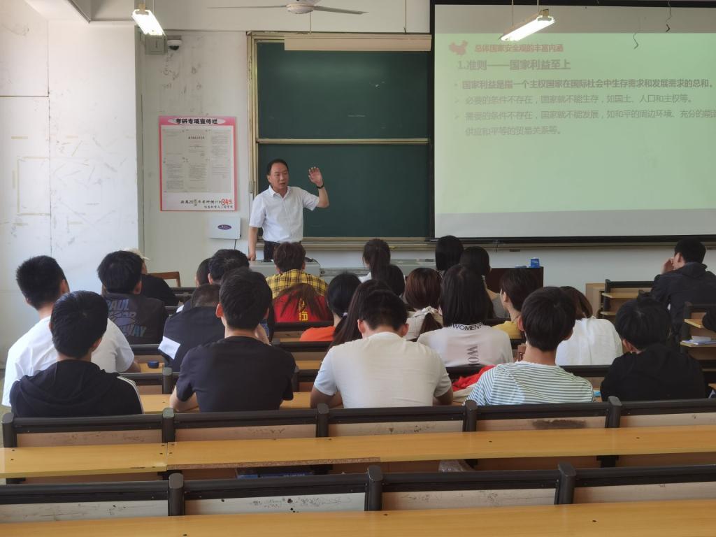学院党委书记张书东围绕“维护国家利益,坚持总体国家安全观”这个主题向2018级计算机科学与技术二班同学讲授了总体国家安全观的丰富内涵,指出新形势下国家安全在意识形态领域、经济领域和军事领域面临的压力和风险,并向同学们提出“我能为国家安全做什么”的问题,希望同学们能够积极了解国家安全法律知识,认真履行维护国家安全的义务。