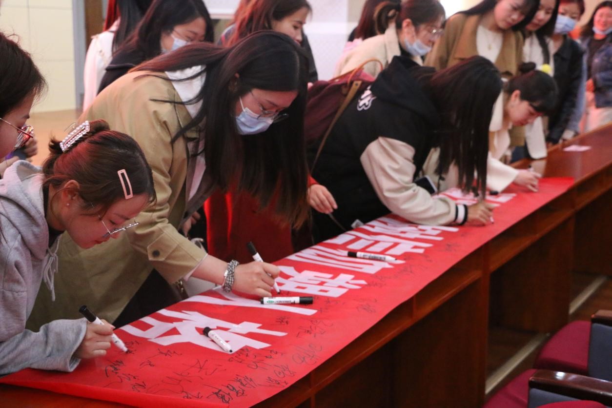 马克思主义学部党委副书记张忠凯宣布,马克思主义学部双经典研读工程正式启动。学生代表申泽睿、张宇涵、杨璐璐就双经典研读工程、参加全国大学生党史知识竞答大会的心得体会作交流分享,吉慧珍、甘慧妹朗诵的《共产党宣言<序言部分>》以及马骏、于霁晴的“青春心向党”主题演讲,将全场氛围推向高潮。在激昂的情绪氛围之中,全场师生起身合唱《没有共产党就没有新中国》,用嘹亮而坚定的歌声为本次大会画上了圆满的句号。会后,全体与会人员在“双经典”研读工程条幅上郑重地签下了自己的名字。