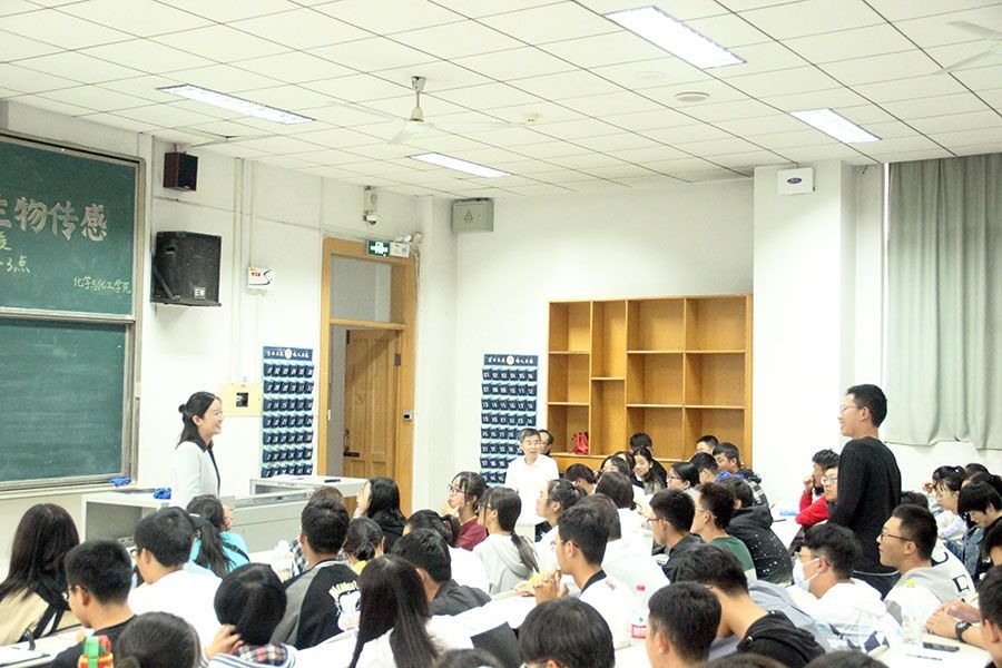 本次邀请到学院渠凤丽教授。渠教授作了题为“恰同学少年-生物传感”的精彩报告。渠教授以如何度过大学时光为主线,从“变、思、勤,从Learn到Research;勇于直面挫败与自己的不足,突破自我;心系家国,饮水思源,做顶天立地的科学研究;用一颗阳光的心面对人生的成败荣辱, 做一个快乐的人”等四个方面,分享了自己的求学经历、研究生培养、生物传感科学研究等经历和感悟,并深入浅出介绍了生物传感创新团队致力于解决生物传感研究选择性、灵敏度及精准性的科学研究思路和成果,引导学生要转变学习的心态和方式,培养科研的钻研精神与态度;保持强烈好奇心和求知欲,对事物、现象和问题不人云亦云,积极思考,培养创新及批判的思维;少功利,多实事,挑战自我,破茧成蝶。最后寄语同学们,恰同学少年,风华正茂;书生意气,挥斥方遒。幽默的话语和浅显易懂的讲述,赢得了在座师生的阵阵掌声。在自由提问环节,渠教授认真细心地回答了同学的问题,澄清了本科生在学习和科研训练上的诸多误区。