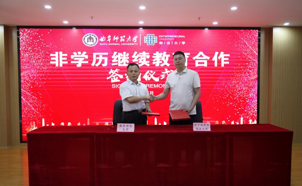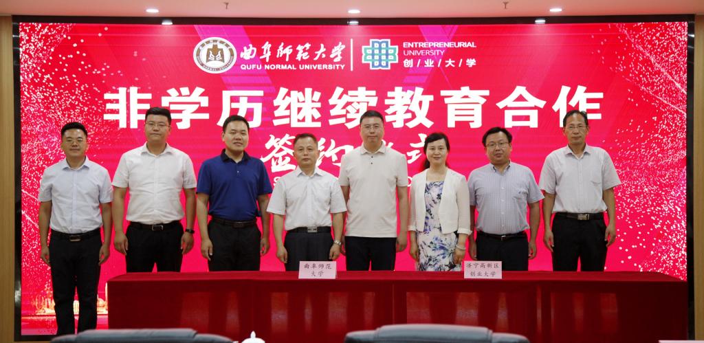 曲阜师大新闻中心讯(通讯员:邢春雷)7月1日下午,我校与济宁高新区创业大学非学历继续教育合作签约仪式在济宁市人社综合服务中心举行。济宁市高新区组织部副部长程辉、济宁高新区创业大学理事长侯全、济宁高新区创业大学常务理事史艳冬、济宁高新区创业大学校长王军、副校长王见峰;我校继续教育学院党总支书记茌淑君、院长马秀峰、副院长邢春雷、自考培训部部长杨来舜等出席仪式。
