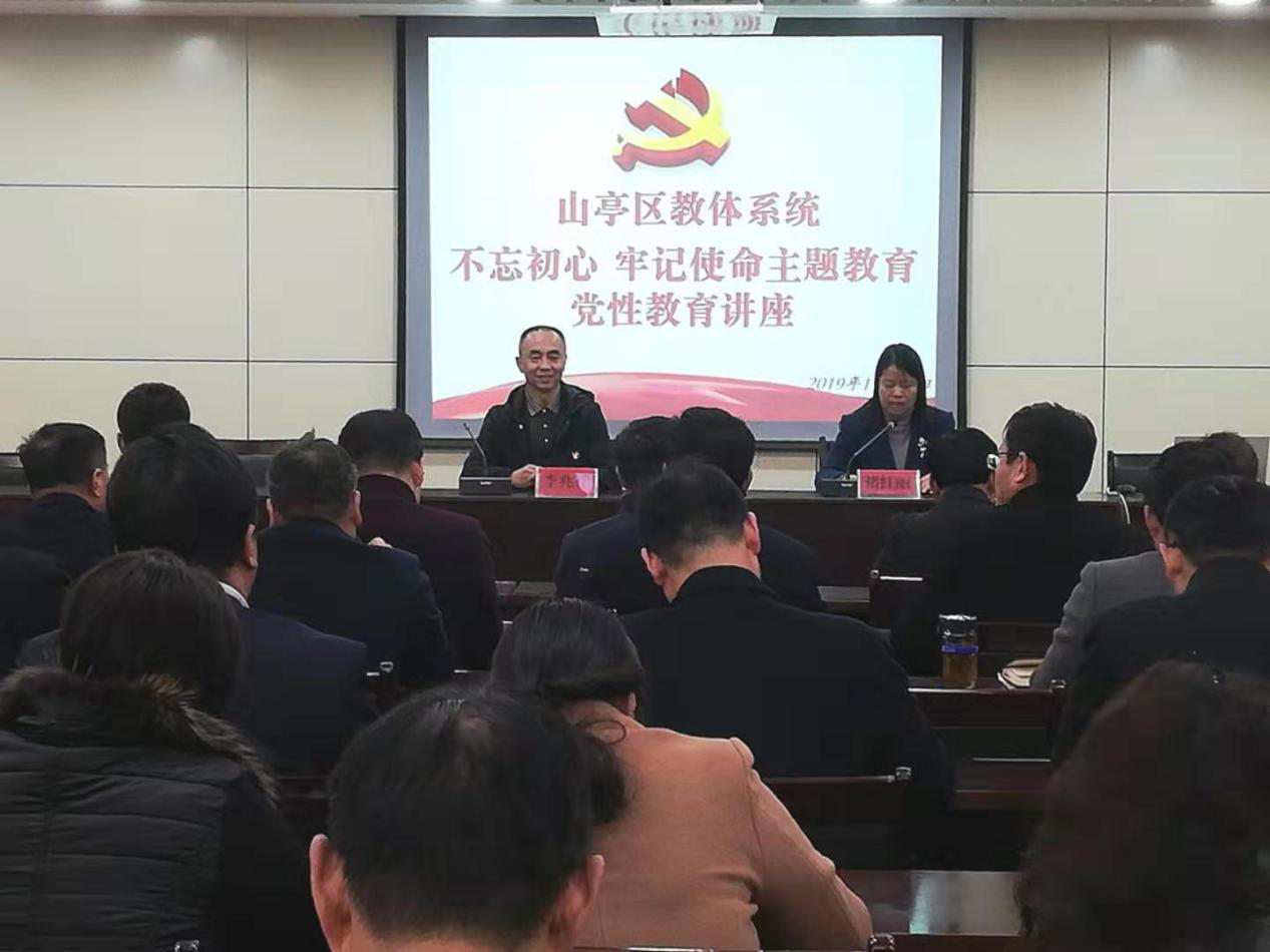 在山亭区教体局,科技处、研究生处一行与教体局负责人进行了座谈,就教师培训、教研合作、教师学历提升、研究生实践、研究生实践导师遴选等方面建立长期合作关系交换了意见。研究生处处长李兆祥应邀为山亭区教体系统作了题为《中国文化自信的底气》的讲座,获得了党员干部的一致好评。