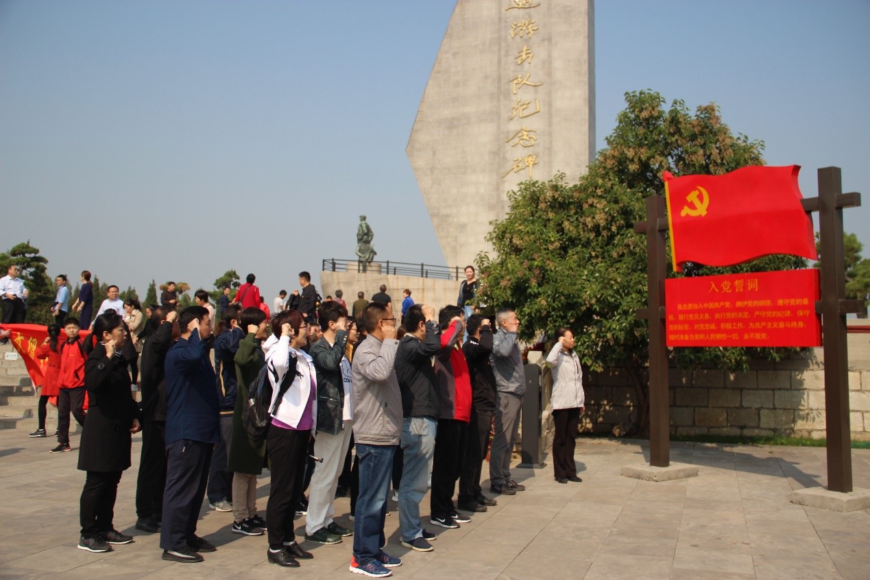 抗日战争时期,微山湖区军民凭着机智过人的胆识、英勇顽强的精神,为中国抗日战争胜利做出了重要贡献。在微山湖铁道游击队纪念园,通过听讲解、观图文、看实物,全体党员重温了铁道游击队光荣的斗争历史,回顾了抗日战争年代的烽火岁月,缅怀了革命先烈的英雄伟绩,思想上和心灵上接受了革命的“洗礼”。在纪念馆内,全体党员齐声合唱《弹起我心爱的土琵琶》,共同追忆那段可歌可泣的光辉岁月。在铁道游击队纪念碑前,全体党员举起右手,重温入党誓词,再次感受入党初心。